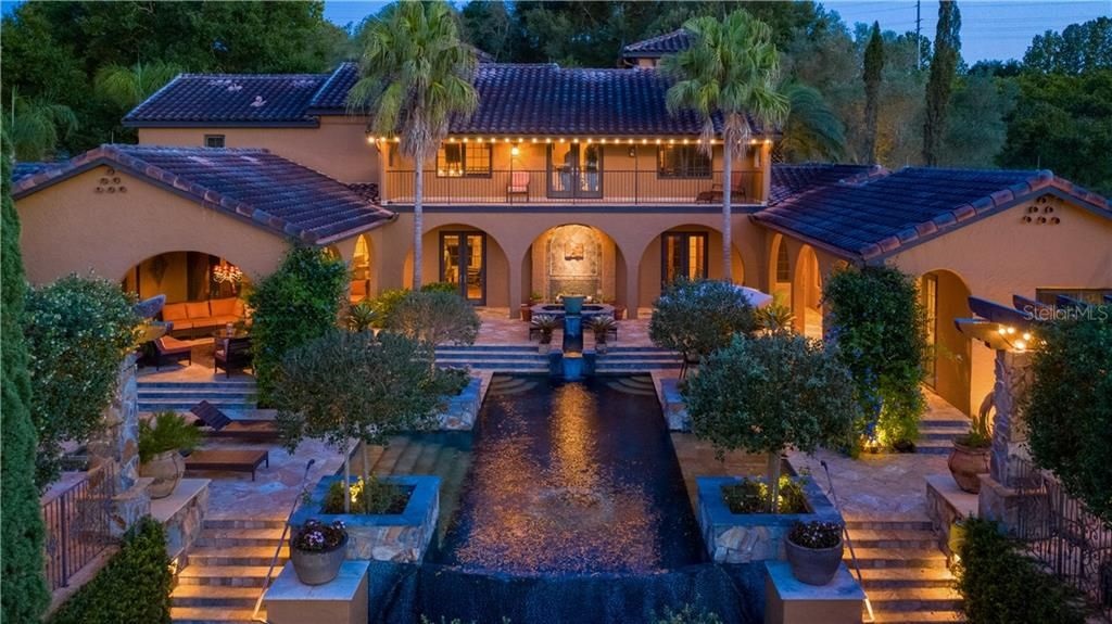 Residential pool design in Mont Verde Florida with multiple levels, scuppers and stone accents to match the residence. The pool was designed to add a pool screen enclosure at a later date which